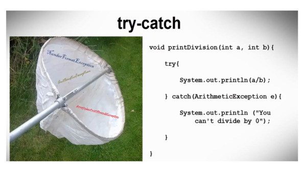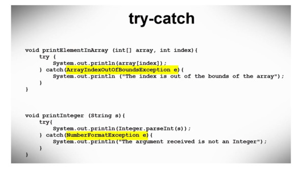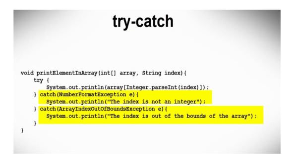 Выражение try-catch также может быть применено к примерам ArrayIndexOutOfBoundsException и NumberFormatException, которые мы видели ранее.