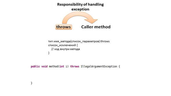 Также вы можете сами, специально, не виртуальная машина, а вы – выбросить исключение с помощью ключевого слова throw, указав тип исключения.