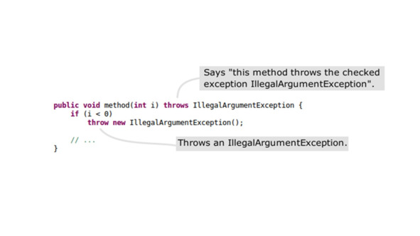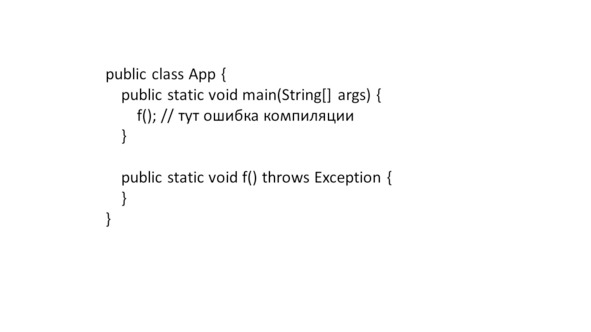 И так как проверяемое исключение проверяется во время компиляции, возникнет ошибка компиляции, если проверяемое исключение не обработано блоком try-catch, или оно не объявлено в заголовке или сигнатуре метода с помощью ключевого слова throws.