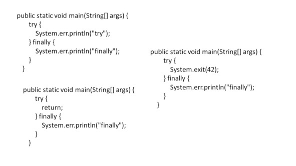 Если виртуальная машина JVM завершает работу во время выполнения кода try или catch, блок finally может не выполняться.