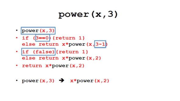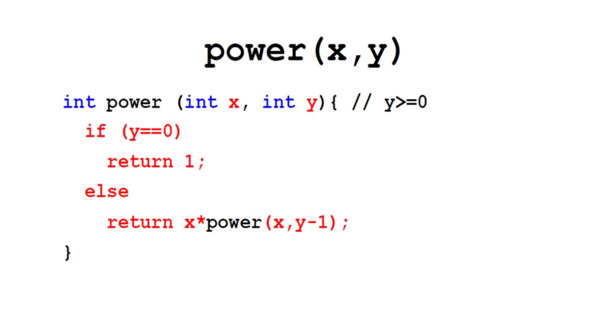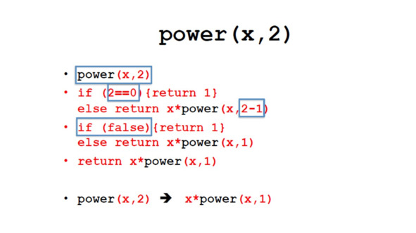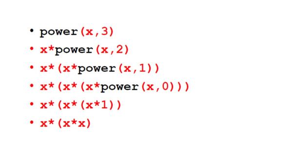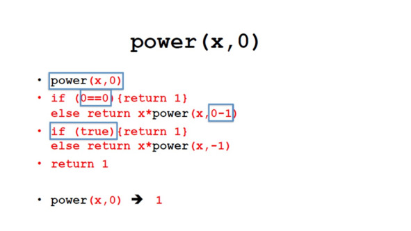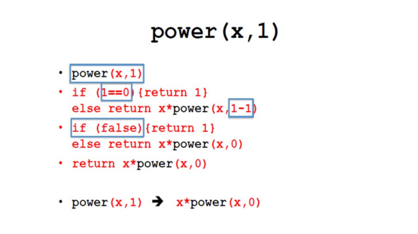 А power (x, 1) равна x умножить на power (x, 0), что равно 1.
