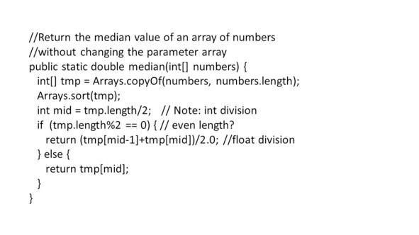 Вот наш метод median, который принимает массив целых чисел в качестве аргумента, и возвращает значение типа double.