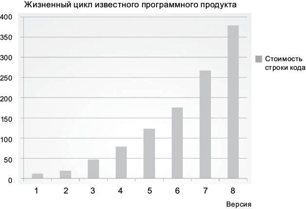 А теперь взгляните на по-настоящему удручающий график: на рис. 1.3 показан рост стоимости строки кода с течением времени.