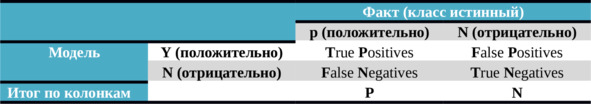 Для понимания сути ошибок I и II рода рассмотрим четырехпольную таблицу сопряженности (confusion matrix), которая строится на основе результатов классификации моделью и фактической (объективной) принадлежностью наблюдений к классам.