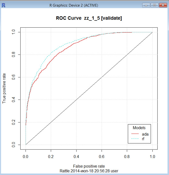 При визуальной оценке ROC-кривых расположение их относительно друг друга указывает на их сравнительную эффективность. Кривая, расположенная выше и левее, свидетельствует о большей предсказательной способности модели. Так, на рис.5.3 две ROC-кривые совмещены на одном графике. Видно, что модель «rf» лучше модели «ada».