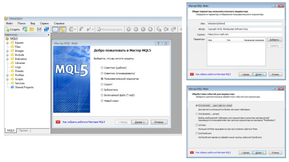 Для обработки вышеуказанных событий необходимо описать такие функции как OnInit (), OnDeinit (), OnCalculate () и OnChartEvent ().