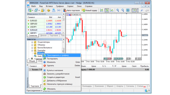После компиляции наш индикатор автоматически появится в торговом терминале и мы сможем присоединить его к графику финансового инструмента.