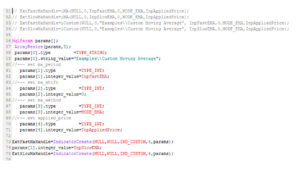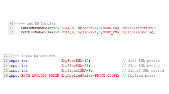 Здесь хэндлы индикаторов – это указатели на индикатор скользящего среднего с разными периодами 12 и 26.