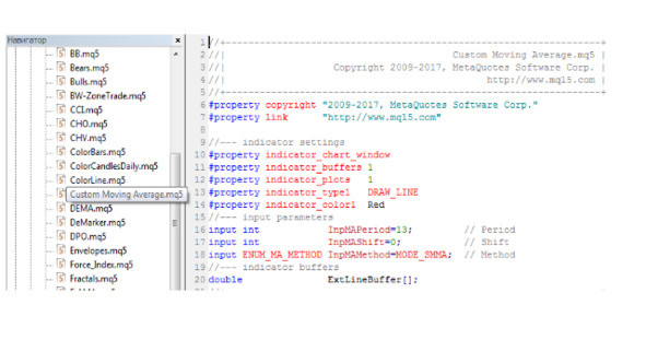 В папке Indicators/Examples редактора MQL5 есть нужный нам индикатор – это файл Custom Moving Average.mq5.