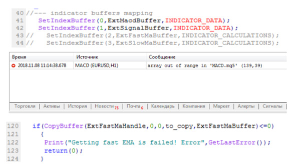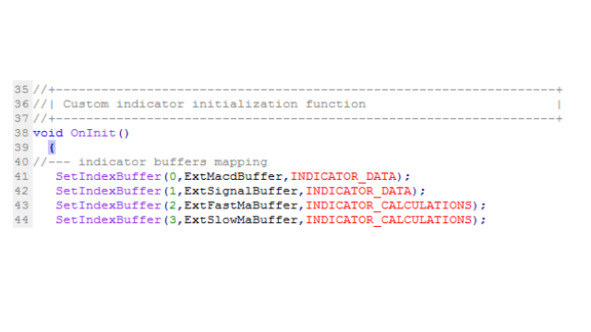 Промежуточные массивы ExtFastMaBuffer и ExtSlowMaBuffer привязаны к буферам индикатора с помощью функции SetIndexBuffer.