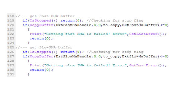 И в эти массивы производится копирование буфера индикатора Moving Average на основе его хэндлов с помощью функции CopyBuffer.