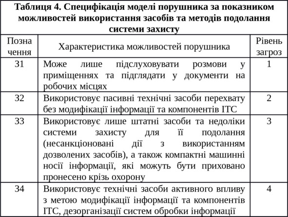 Для побудови моделі використовуються усі можливі категорії, ознаки та характеристики порушників для більш точного їх аналізу, причому рівень загрози кожної з них оцінюється за 4-бальною шкалою.