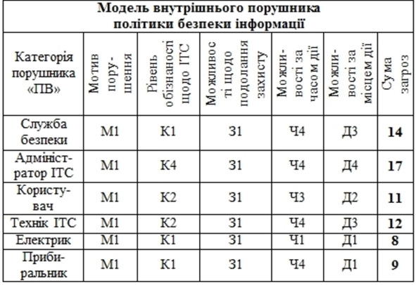 Висновок: з останньої таблиці видно, що найбільшу загрозу, що має відношення до проблеми захисту інформації, становить адміністратор ІТС. Тому організація роботи цієї особи повинна бути найбільш контрольованою, оскільки вона є основним потенційним порушником безпеки інформації.
