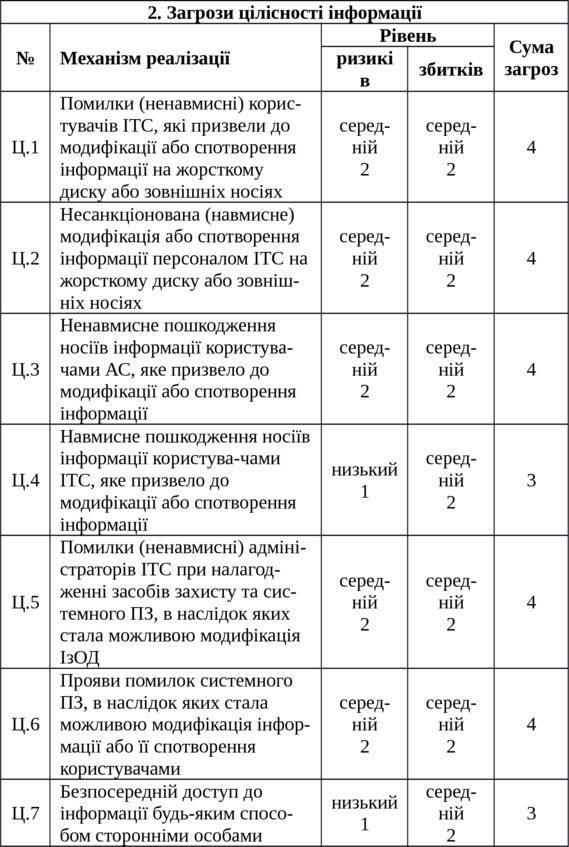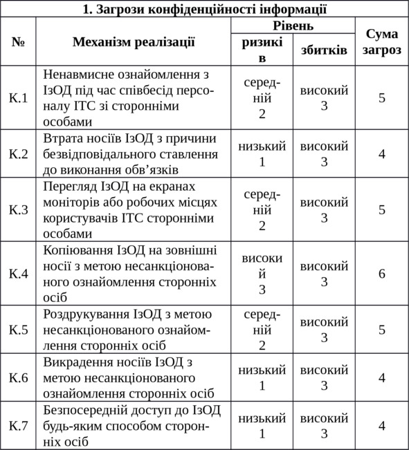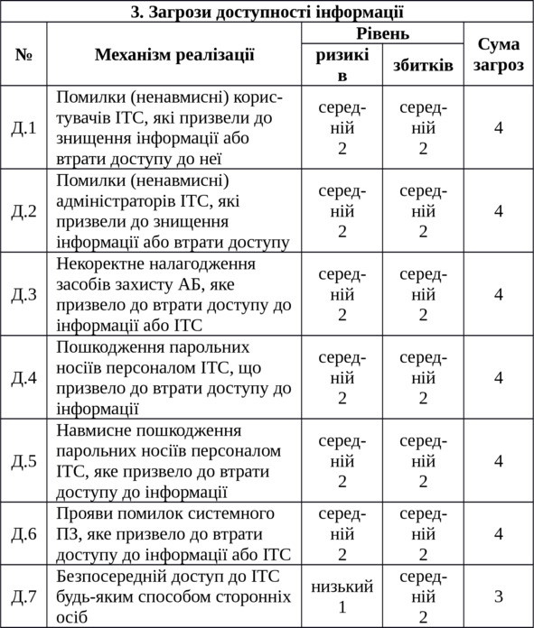 Перелік суттєвих загроз має бути максимально повним і деталізованим. Для кожної з загроз необхідно визначити її спрямованість, джерело, механізм реалізації та можливі наслідки.