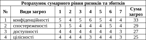Зробимо розрахунок загроз з урахуванням 3-х рівнів ризиків і збитків: якщо реалізація загрози надає великих збитків – високий – 3 бали; помірних збитків – середній – 2 бали; незначних збитків – низький – 1 бал. Отримаємо «Модель загроз з визначенням рівня ризиків і збитків» у вигляді 4-х таблиць (загрози конфіденційності, цілісності, доступності та спостереженості).