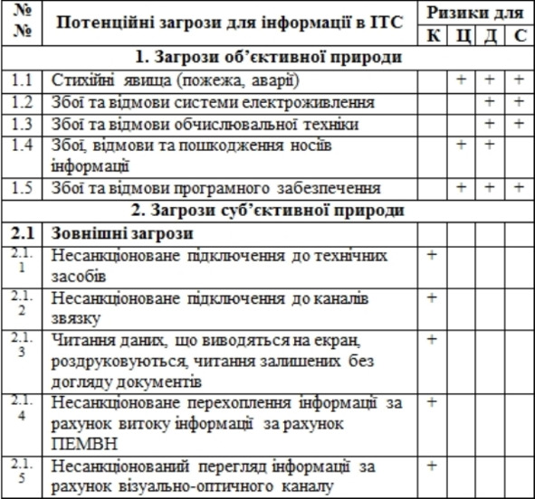 Після проведення обстеження всіх середовищ ІТС необхідно визначити всі можливі потенційні загрози для ІТС. Походження загроз може бути випадковим і навмисним.