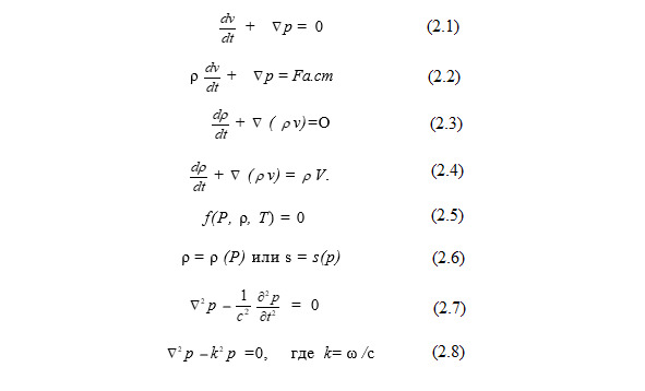 Математическая модель акустического поля представлена полной системой уравнений акустики, которая состоит из уравнений движении, уравнения непрерывности и уравнения состояния. Уравнения акустики кратко можно характеризовать так. [3].
