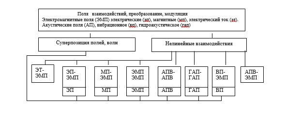 Рассмотрим информацию как многообразия физических полей, их суперпозиции и нелинейных взаимодействий. Взаимодействие составляющих физических полей показаны на рисунке 4.