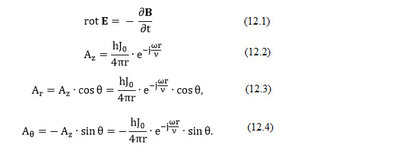 Для случая переменных токов, когда установилось стационарное состояние системы и все величины изменяются пропорционально ej?t то есть, значение тока задано, определение полей может быть произведено с помощью запаздывающих потенциалов, рассмотренных в Л1. Было найдено подходящее для этих целей выражение для вектор-потенциала A. Так как вектор тока направлен по оси z, то и вектор-потенциал может быть только в этом направлении. Для любой точки Q, радиус-вектор которой равен r, вектор А, согласно Л1, выразится простой формулой (12.2), или, в сферической системе координат (12.3 – 12.4) (рис.11).
