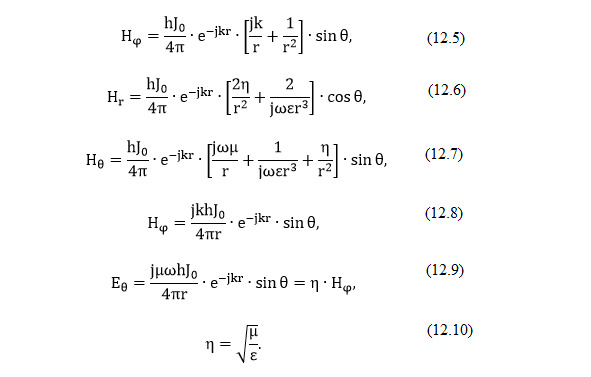 На очень больших расстояниях от источника в выражениях Е и Н наибольшее значение играют члены, содержащие только 1/r (12.8 – 12.10).