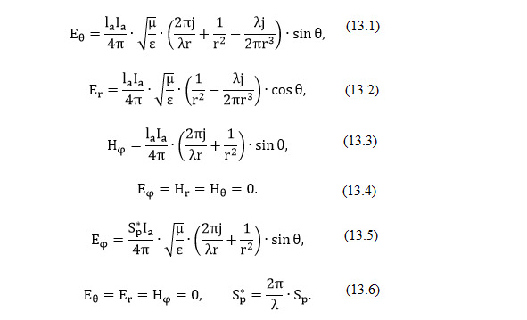 В общем виде поле, создаваемое элементарным электрическим (или магнитным) вибратором в какой-либо точке, состоит из нескольких составляющих, величины которых зависят от направления излучения, излучаемой длины волны и расстояния г от излучающего вибратора. В сферической системе координат действующие значения составляющих поля (без учета фазы) имеют вид (13.1 – 13.4).