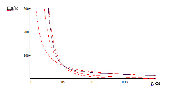 Пунктирными линиями показаны все составляющие поля (1/r3,1/r2, 1/r), а сплошной линией соответствует суммарная напряженность.