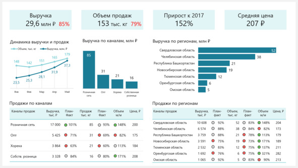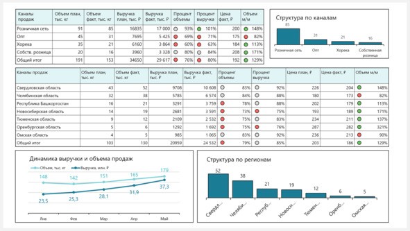 Вот другой вариант этого же дашборда. Уже становится понятней: наверху расположены самые важные показатели, дальше – диаграммы и графики выручки, в нижней половине отчета есть таблицы с подробностями по каналам продаж и регионам. Вся картинка словно разделена на невидимые, но логичные части.