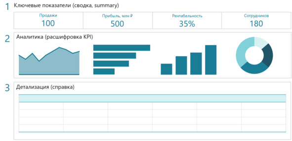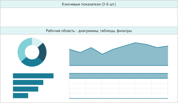 Дашборд не всегда содержит таблицы. В нем могут быть только ключевые показатели и диаграммы. Или наоборот, ключевые показатели и одна большая таблица. Но всегда надо соблюдать правило очередности уровней: сначала KPI, потом диаграммы и после них таблицы, если они есть. Иногда я на своих курсах объясняю это так: у дашборда всегда есть «шапка» с самой важной информацией и рабочая область с основным содержанием.