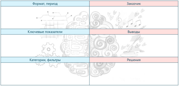 В левой половине – логика, факты по существу: в каком формате будет представлен отчет, с какой периодичностью будут обновляться данные, какие ключевые количественные показатели и в каких разрезах (фильтрах, категориях) будут отображены. Справа – творческое полушарие, ассоциативное мышление. Эти пункты находятся за рамками самого отчета: заказчик, его выводы и решения. Давайте разберем подробнее «левое полушарие».