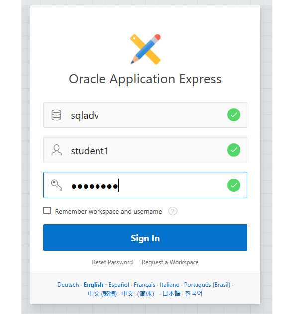 Первое поле сверху мы заполняем SQLADV, во второе поле мы вносим имя пользователя student1 и заполняем пароль – также student1.