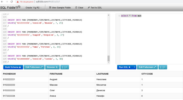 Нажмите кнопку RUN SQL, и далее в нижней части экрана должен появиться результат выполнения запроса.