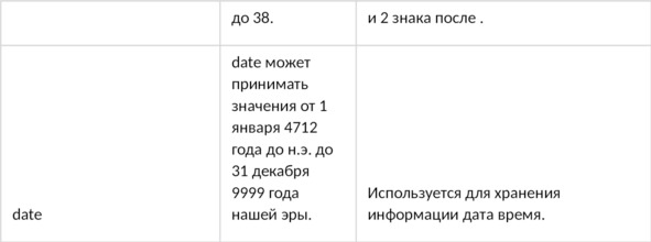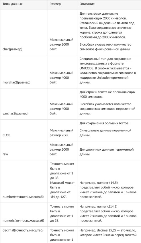 Ниже приведена таблица основных типов данных, используемая в SQL ORACLE. В таблице колонка-размер означает, какой максимальный объем информации сможет вместить этот тип данных. Например, тип данных VARCHAR2 может вместить в строку длиной не более 4000 символов.