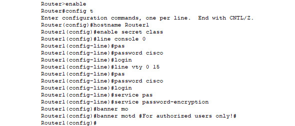 Рисунок 1 – Пример базовых настроек в Cisco IOS. Скриншот сделан в Cisco Packet Tracer