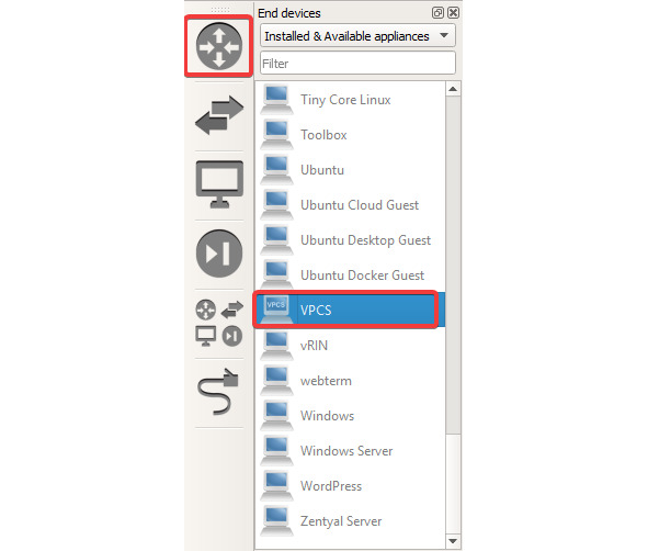 Добавим в сеть маршрутизатор и два компьютера VPCS из раздела с оконечными устройствами (рисунок 32). Пример окончательной топологии продемонстрирован на рисунке 33.