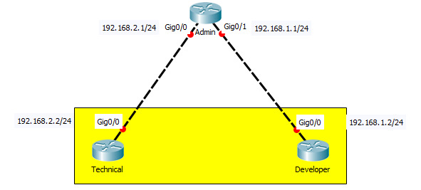 Те же самые настройки сделаем и для остальных маршрутизаторов в нашей сети. Вдобавок назначим имя устройству и совершим проверку соединения с маршрутизатором Admin путем использования команды ping. Приведем пример настройки маршрутизатора Technical.