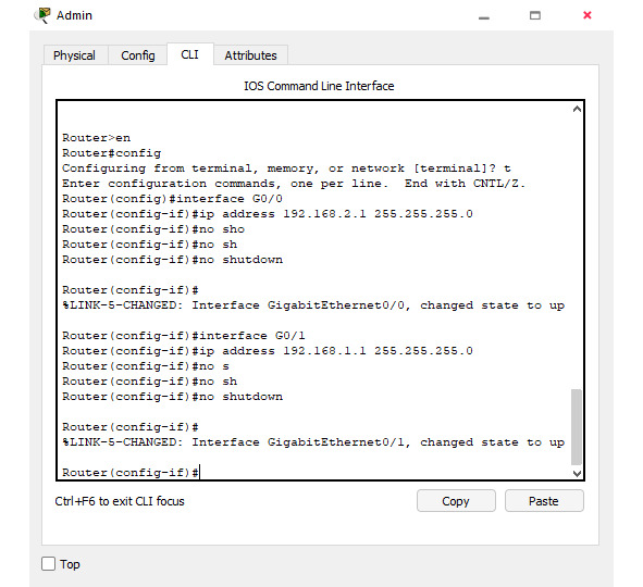 Перейдем к настройке маршрутизаторов. Интерфейсу назначим соответствующий IP-адрес с указанием маски подсети и включим интерфейс командой no shutdown. Пример настройки маршрутизатора Admin согласно созданной нами топологии (рисунок 60).