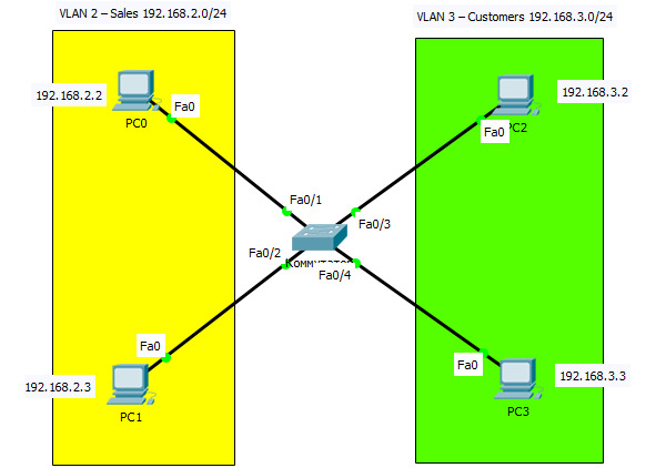 Произведем настройку коммутатора. Компьютеры PC0 и PC1 отнесем к VLAN 2, а компьютеры PC2 и PC3 отнесем к VLAN 3.