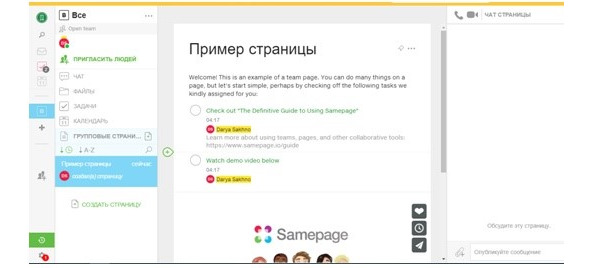 SamePage – англоязычный сайт для командной работы онлайн, есть русский язык.. Многофункционален, бесплатный аккаунт позволяет использовать огромное количество инструментов, которых вполне достаточно для полноценной работы. При регистрации подключается ПРО сроком на 30 дней, бесплатной версией можно пользоваться бесконечно.
