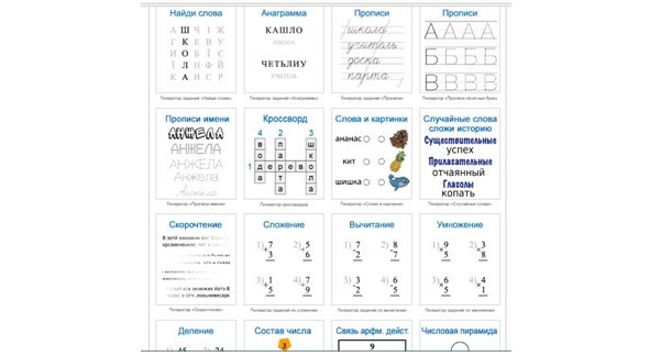 ChildDevelop – русскоязычный бесплатный сервис, с помощью которого можно создать различные задания (прописи, анаграммы, кроссворды и т.д.). Удобный и простой в использовании, результаты можно скачать.