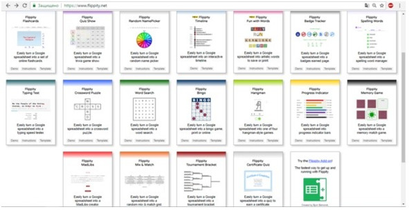 Flippity – еще один англоязычный ресурс для создания игр и упражнений. Позволяет сконструировать 19 видов игр. К каждой своя инструкция («Instructions»), задания вводятся в Google Docs, система генерирует приложения автоматически.