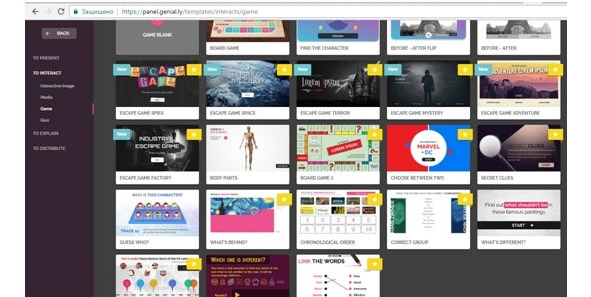 Genially – уникальный ресурс для создания разнообразных интерактивных активностей (игр, презентаций, видео, заданий, тестов, карт и т.п.). Есть бесплатный аккаунт, который позволяет использовать только бесплатные шаблоны.