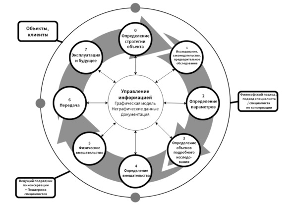 Рис. 6. Принцип жизненного цикла информационного моделирования исторических зданий, заимствованный из циклической диаграммы BIM Отраслевого совета по строительству (CIC), лучше отражает процессы консервации объектов