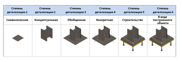 Например, компонент, смоделированный в самой низкой (символической) СД может включать полную спецификацию продукта. С точки зрения сбора метрических данных, необходимая СД для BIM существующего объекта напрямую зависит от спецификации разрешения (плотности точек для лазерного сканирования).