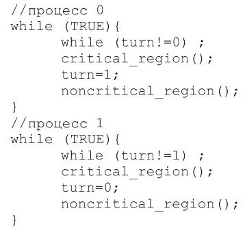 Целая переменная turn, изначально равная 0, отслеживает, чья очередь входить в критическую область. Здесь для того, чтобы 0-ой процесс вошел в область, turn должна быть равна 0, а 1-ой – turn равна 1.