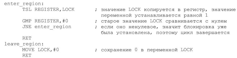 (Test and Set Lock – проверить и заблокировать), которая действует следующим образом. В регистр RX считывается содержимое слова памяти LOCK, а в ячейке памяти LOCK сохраняется некоторое ненулевое значение. Операция считывания слова неделима. Процессор, выполняющий команду TSL, блокирует шину памяти, чтобы остальные процессоры, если они есть, не могли обратиться к памяти.