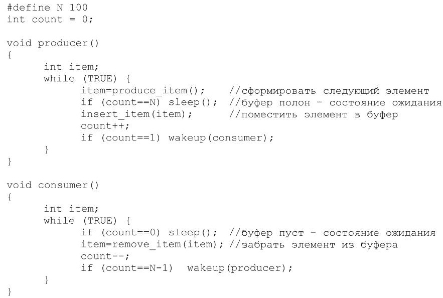 Для описания на языке С системных вызовов sleep и wakeup они были представлены в виде вызовов библиотечных процедур. В стандартной библиотеке С их нет, но они будут доступны в любой системе, в которой присутствуют такие системные вызовы. Процедуры insert_item и remove_item помещают элементы в буфер и извлекают их оттуда.