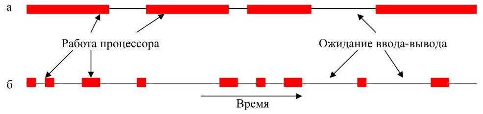Рисунок 14 – Периоды использования процессора, чередующиеся с ожиданием ввода-вывода: процесс, ограниченный возможностями процессора (а); процесс, ограниченный возможностями устройств ввода-вывода (б)
