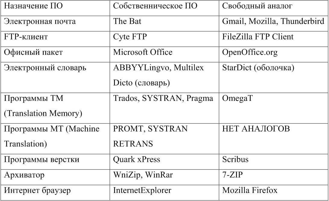 Представим в таблице программы, которыми пользуются переводчики в профессиональной деятельности и аналоги свободного ПО (см. таблицу 1).