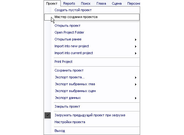 Итак, вы установили русский язык в yWriter5, теперь надо быстро освоиться с программой. После локализации выбираем в верхнем меню «Проект» подпункт «Мастер создания проектов». Он вежливо предложит создать новый проект.