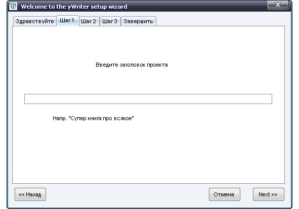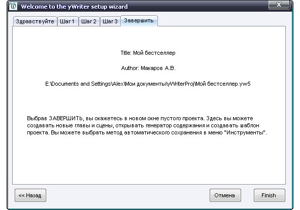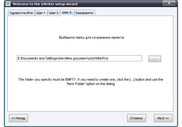 Лучше всего последовать советам «Мастера создания проектов». Этот мастер поможет вам настроить новый проект yWriter. Следуем предложенным трем шагам.